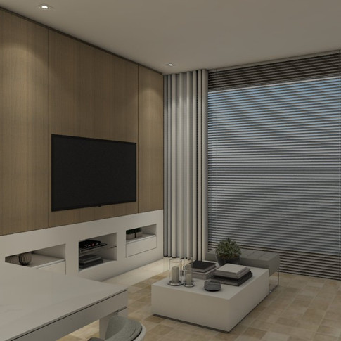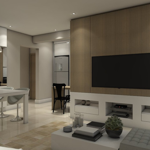 Este é um apartamento com duas suítes na cidade de Novo Hamburgo, com sala de estar, jantar e cozinha integrados. A churrasqueira (que era na sala!) ficou escondida no painel da TV, já que o cliente confirmou que não usaria. Assim conseguimos criar um móvel multi funcional, que além de apoiar a TV e equipamentos, é cristaleira junto à bancada de refeições e conta ainda com uma porta oculta à direita da TV, com muito espaço interno. Na cozinha, o microondas é também depurador. Na suíte do casal, um closet com portas de correr em espelho amplia o espaço, com móveis e papel de parede em cores neutras. Tudo bem organizado, porque em apartamentos pequenos precisamos otimizar os espaços!