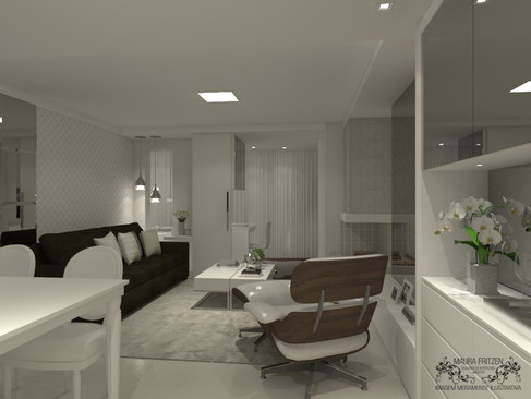 Projeto da área social de um apartamento em Caxias do Sul, onde os ambientes integrados com o home office permitem trabalhar em casa com conforto. Neste apartamento também projetamos o dormitório do bebê, já pensando no seu uso futuro! A bancada trocador será a bancada de estudos, e os nichos cor de rosa, quando repintados, junto com a troca do papel de parede, transformarão completamente a atmosfera do ambiente. Espaços bem planejados, economicamente viáveis!